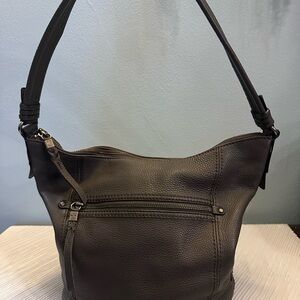 he Sak Sequoia hobo shoulder bag in pebbled leather. Features top zipper closure, interior zipper and slip pockets, and comfortable shoulder strap. Classic everyday silhouette with soft structured shape. Genuine leather body. Great condition. This elegant leather shoulder bag is perfect for any occasion. Its sleek design and high-quality material make it a must-have accessory.