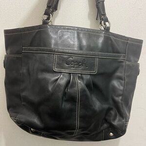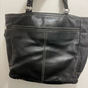 Vintage Sleek black leather tote by Coach. Features silver hardware and elegant stitching. Perfect for versatile style.