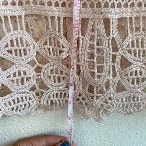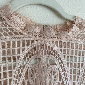 Elevate your wardrobe with this stunning blush pink crochet lace top by Mele e Pere. Featuring an intricate geometric lace pattern, scalloped hem, and high neckline, this piece is perfect for brunches, date nights, or special occasions. The sheer design makes it ideal for layering over a bralette or cami for a chic, feminine look.