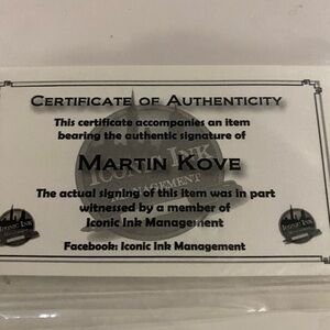 Signed photo of Martin Kove. Features a stylish tan coat and a COA