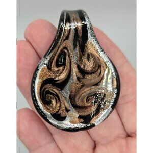 Handcrafted Murano Style Glass Pendant Swirling Bronze & Silver Art Jewelry Stat