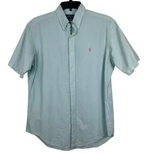 Ralph Lauren Seersucker Shirt men's Large classic fit, blue\ white stripe short sleeve button down , pink horse