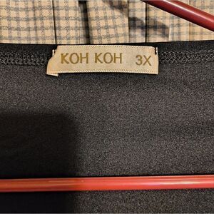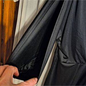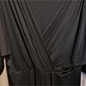 black simple, cross front polyester dress. open cut sleeve, elastic waist. I paired it with a rhinestone belt for a formal look
