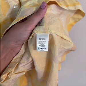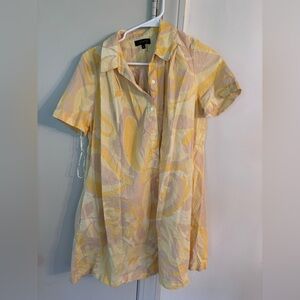 Chic button-up dress with abstract yellow and pink design. Ideal for casual wear.