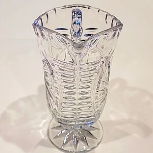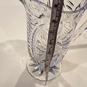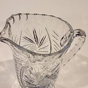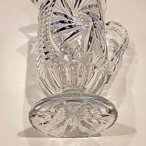 Beautiful crystal pitcher with intricate cut glass design. Perfect for serving beverages in style.