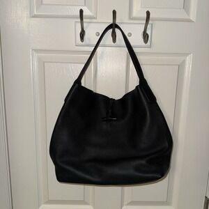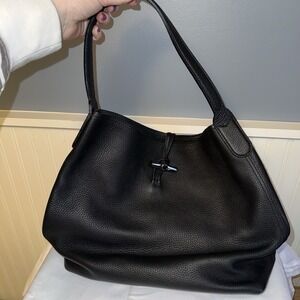 Longchamp Roseau Essential Leather Hobo Shoulder Bag Purse Black Pebbled Large