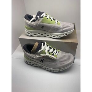 On Cloudstratus 3 running shoes in the Pearl Ivory colorway offer maximum cushioning and support for road running. These high-performance sneakers feature double CloudTec layers and Helion superfoam for a responsive, energized ride. The breathable engineered mesh upper is complemented by a supportive heel cage and a secure lacing system in a stylish neutral palette with lime green accents. Designed with a wide fit and a Speedboard for powerful take-offs, these shoes are perfect for long-distance training or everyday comfort.