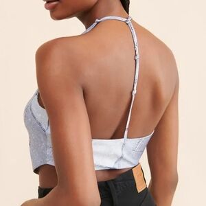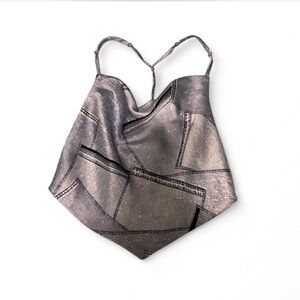 Get the denim-on-denim look without the heavy fabric! This silky crop top features a modern cowl neckline and a unique T-strap back design. The patchwork denim print is perfect for a festival, a night out, or pairing with your favorite high-waisted jeans.