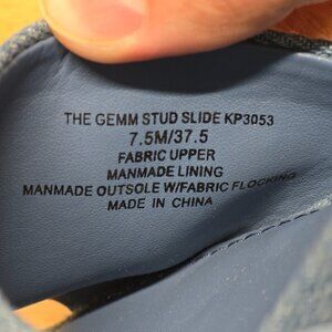 This pair of Katy Perry The Gemm Stud Slide Sandals in blue denim is a stylish and unique addition to any footwear collection. Featuring an eye-catching studded design, the slides offer a bold yet casual look that can easily transition from daytime wear to evening outings. The denim material gives the sandals a trendy, laid-back vibe, while the sleek silhouette adds a modern edge.