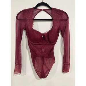 Victoria's Secret burgundy lace bodysuit featuring sheer mesh long sleeves, underwire cups, and intricate lace detailing throughout. Elegant high-neck back closure with delicate scalloped trim and romantic eyelash lace accents. Structured bust offers support while sheer panels create a flattering, sultry silhouette. Perfect for lingerie styling, boudoir looks, layering under blazers, or statement date-night outfits.