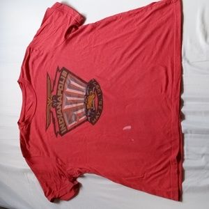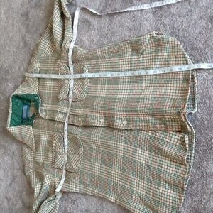 Tan, green and red houndstooth check button down shirt, likely from the 70s-80s. There are several small areas of wear/holes, especially along hemline but two near shoulders. I have tried to find and photograph each imperfection and I believe there are five in all.
