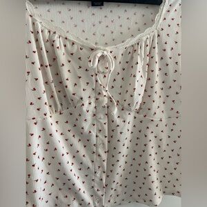 Cream ribbed fabric with red cherry print throughout. Features lace trim neckline, decorative front bow detail, and faux button front (buttons are decorative only and do not open). The tie detail is also decorative and not adjustable.