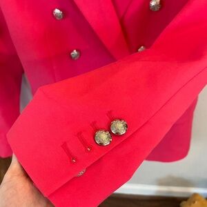 Stylish double-breasted blazer in vibrant pink. Features sleek design and button details. Ideal for professional or casual wear.