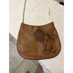 The Disney Faux Leather Bag with Nautical Strap is a stylish and practical crossbody bag designed for women. The brown exterior made of faux leather, combined with the white nautical rope handle/strap, creates a chic and trendy look. The brown lining adds a touch of sophistication to the overall design. Perfect for those who appreciate a touch of Disney magic in their everyday accessories. The bag measures 12 inches high and 15 inches wide. Handles drop is 21 inches. This bag is in excellent condition.