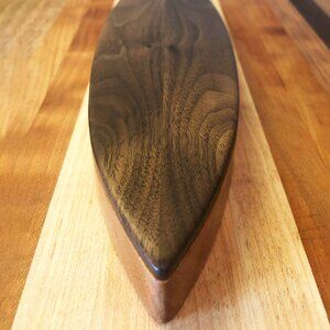 This handmade jewelry box in the shape of a surfboard is perfect for any surfing enthusiast. This is from my personal collection. Made from wood and crafted in the United States, this unique piece is ideal for storing jewelry or small treasures. Its original design and handmade quality make it a special addition to any home decor, suitable for all occasions and adding a touch of surfing theme to the space. With its dimensions of 10 7/8" inches in length, this surfboard wood box is a functional and stylish collectible item. Jewelry not included.