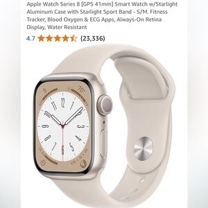 Apple smartwatch with sleek silver band. Includes charger and cable, and extra sleek metal band.