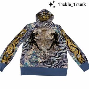 This item is a vintage Christian Audigier x Ed Hardy full zip-up hoodie featuring a skull, panther, and chain graphic print. Christian Audigier was the designer for the Ed Hardy brand, which became well-known for its Y2K-era tattoo-inspired designs.