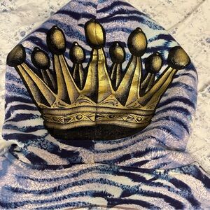 Design: The hoodie features an all-over blue tie-dye or animal print with large graphics of a skull on the front, two black panthers on the chest and shoulders, and gold chain prints running down the sleeves. It has a gold inner lining.