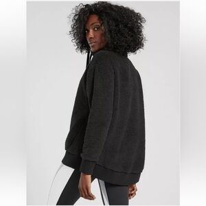Embrace warmth with this black fleece hoodie. Features a cozy high neck and front pockets. Ideal for casual wear.