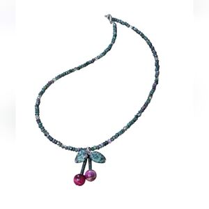 Charming handcrafted necklace with Ruby Zoisite stones and Cherry pendant beads. Perfect for any occasion.