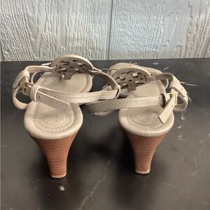Chic Tory Burch sandals in light gray. Features signature logo detail. Ideal for versatile styling.