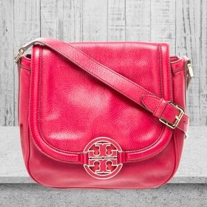 Brand new with tags Tory Burch Amanda crossbody in vibrant red pebbled leather. Features signature oversized gold medallion logo, curved flap silhouette, and adjustable crossbody strap.