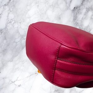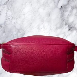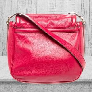 Stunning Tory Burch Amanda saddle bag in bold red pebbled leather. Features signature oversized gold medallion logo, curved flap silhouette, and adjustable crossbody