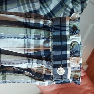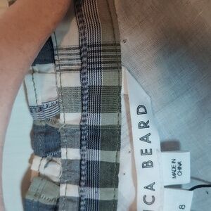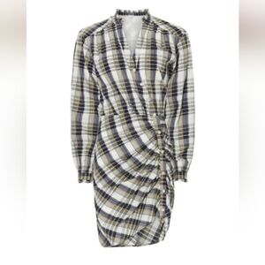 Veronica Beard's Vilette shirtdress is crafted of a cotton blend. Decorated with a plaid pattern, this mini-length style is detailed with a surplice neck, long sleeves, and a ruched skirt. Surplice neck Long sleeves Button front 65% cotton/15% viscose/15% polyester/1% metallic fiber