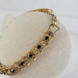 Vintage Gold Tone Rhinestone Link Bracelet Blue Clear Stones 8" Lobster Clasp