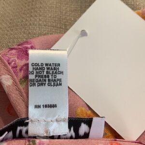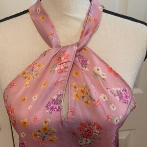 NWT Beautiful satin top with halter neck. Pullover and sleeveless. Color Pink background with floral print. Size M Poly/Spandex 18” PTP & 22” L