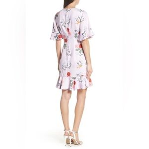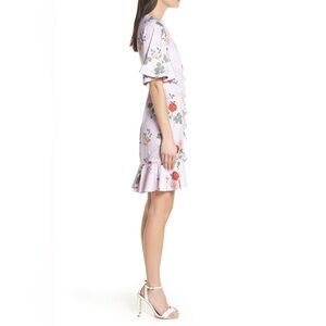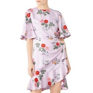 Sweet and shapely, this bloom-print dress is styled with frill-trimmed elbow-length sleeves and an asymmetrical ruffled hem.