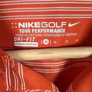 This is a Nike Golf Tour Performance Dri-fit Men's Polo in size M. The polo shirt is orange with white stripes, featuring short sleeves and a collared neckline with a button closure. Made of polyester, it is designed for golf with moisture-wicking and breathable properties. The brand is Nike, and the model is Nike Tour Performance, suitable for all seasons and made in Vietnam.