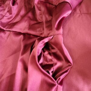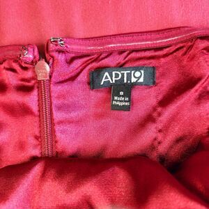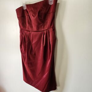 Pre-owned in good condition. Womens size 8. Red/burgundy strapless cocktail dress by Apt. 9 featuring a pleated bodice, defined waistband, and flattering knee-length silhouette. Sateen-style polyester/spandex blend with slight stretch, fully lined with back zipper closure and pockets. Great for weddings, parties, dances, or holiday events.