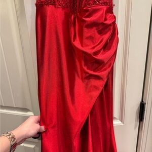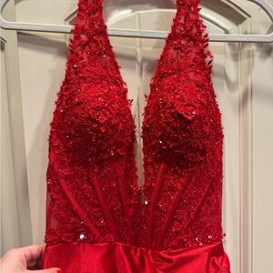 Dazzling red dress with intricate lace bodice. Features a deep V-neck and high slit. Perfect for prom night.