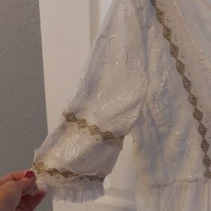 Elegant cream dress with lace details. Features a V-neck and ruffled sleeves. Perfect for a chic look.