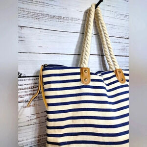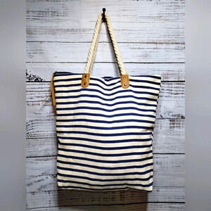 Introducing the Summer Rose Striped Nautical Beach Tote! This fabulous tote features rope handles and comes in an extra-large size of 16" x 16". Perfect for your beach adventures, this tote combines style and functionality. Carry all your essentials in this trendy bag and make a fashion statement wherever you go. Get ready to turn heads with the Summer Rose Striped Nautical Beach Tote! I purchased and never used.