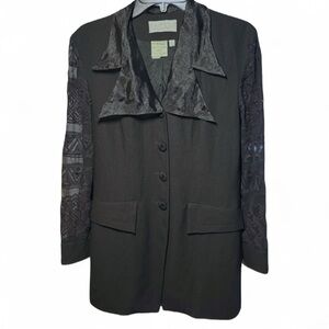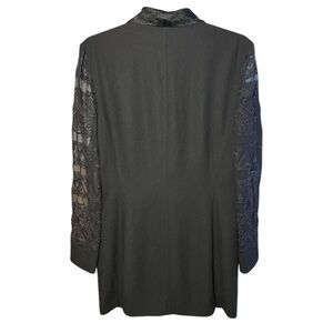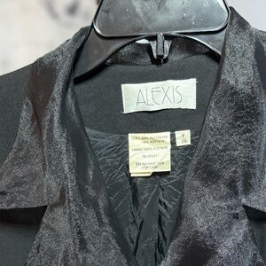 Vintage ALEXIS Blazer Dress w/ Lace Sleeves - SIZE: Vintage size 8 (fits like modern S/M — see measurements) Made in USA Approx. measurements (flat lay): - Pit to pit: 19 inches - Length: 39 inches Description: Elegant and edgy, this vintage ALEXIS blazer dress is a standout piece for your wardrobe. Features sheer embroidered lace sleeves, a luxurious satin shawl collar, and a tailored fit that can be styled as a blazer or worn solo as a mini dress. Perfect for evenings out, vintage collectors, or bold office looks. - Black button-down blazer dress - Dramatic satin lapel - Sheer lace sleeves with embroidery & geometric detailing - Made in USA - Excellent vintage condition — no flaws to note