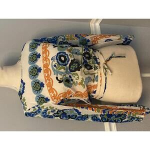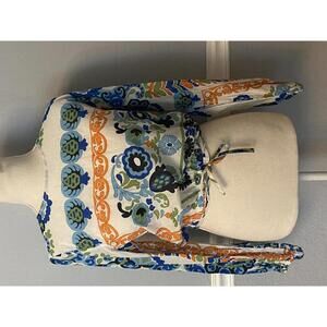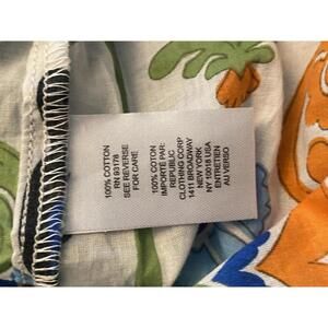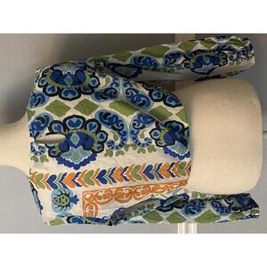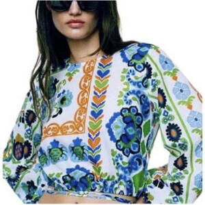This women's long sleeve crop top features a vibrant blue, green, and orange floral print on a white background.