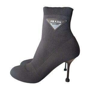 Keywords: Prada boots, sock boots, stiletto heels, designer footwear, Italian fashion, luxury shoes, ankle bootie, pointed toe, statement heels, fashionable footwear, evening shoes, chic style