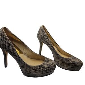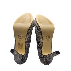 Michael Kors Snake skin Heels with gold logo hardware are gorgeous! 4.5" Heel and 1" on the front of toe area. There are a few very small spots on the inside as pictured but on the exterior are in excellent condition. No scuffs, tears, spots, wear because they were worn only a couple of times. My pictures turned out a little dark but the main photo depicts exactly how they look! Money back guarantee. Quality and gorgeous shoes!