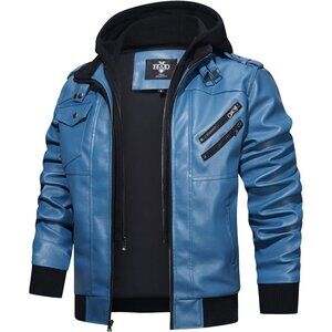 Men’s Blue Casual Stand Collar Pu Faux Leather Motorcycle Bomber Jacket