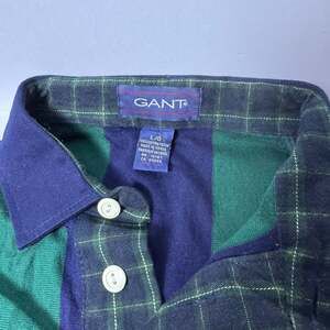Stylish Gant polo sweatshirt with bold green and blue stripes. Features a classic collar and embroidered logo.