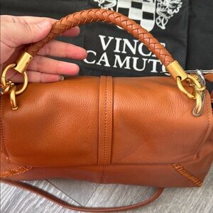 Chic Vince Camuto satchel in rich burnt orange. Features a braided handle and gold-tone accents. Stylish and versatile.