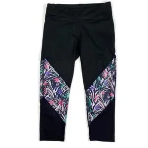 Fabletics Mesh Powerhold Capri Leggings Mid Rise Floral Black UPF 50+ Size Sm
