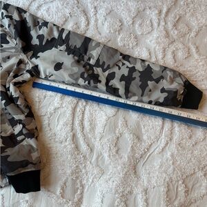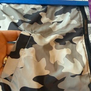 Stylish camouflage bomber jacket with a zip-up front. Features a classic camo pattern in black, gray, and white. Pockets on both reversible sides. Small pocket on sleeve. EUC. Lightweight
