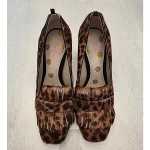 Boden Women's Chunky Heel. Leopard Print/Calf Hair. Fringed Loafer. Square Toe. Size 36. In Excellent Preowned Condition.