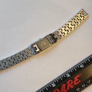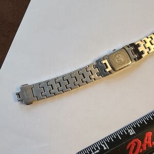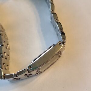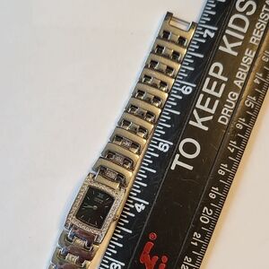Stylish Citizen watch with a black face. Silver band adorned with sparkling stones.