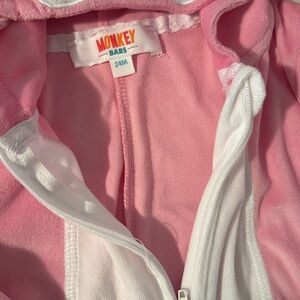Cozy pink animal onesie with cute face on hood. Perfect for lounging. Super cute.