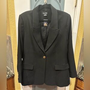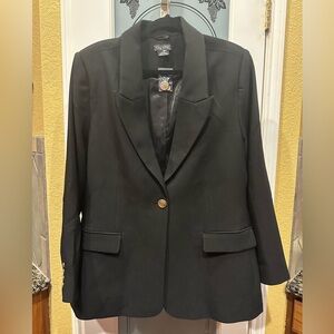 Sophisticated black blazer with a gold button. Tailored fit and notched lapel. Ideal for professional settings.