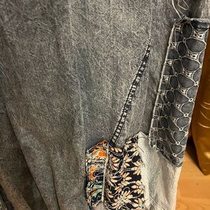 Stylish patchwork denim jumpsuit. Features unique patterns and button details. Perfect for casual wear.